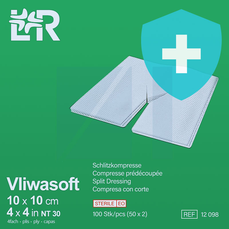 Vliwasoft® Split Dressing/ Фливасофт Сплит Дрессинг стерильные мягкие нетканые дренажные салфетки c Y-образным вырезом от компании Lohmann & Rauscher (L&R)/ Ломанн и Раушер; 10х10 см; 4 слоя; 100 шт/уп (50х2)