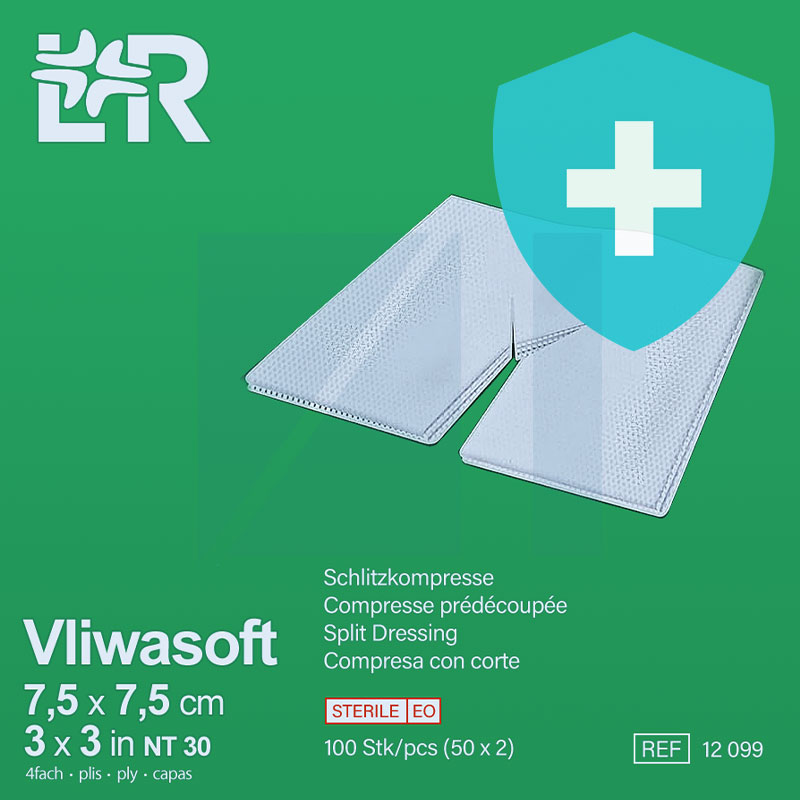 Vliwasoft® Split Dressing/ Фливасофт Сплит Дрессинг стерильные мягкие нетканые дренажные салфетки c Y-образным вырезом от компании Lohmann & Rauscher (L&R)/ Ломанн и Раушер; 7,5х7,5 см; 4 слоя; 100 шт/уп (50х2)