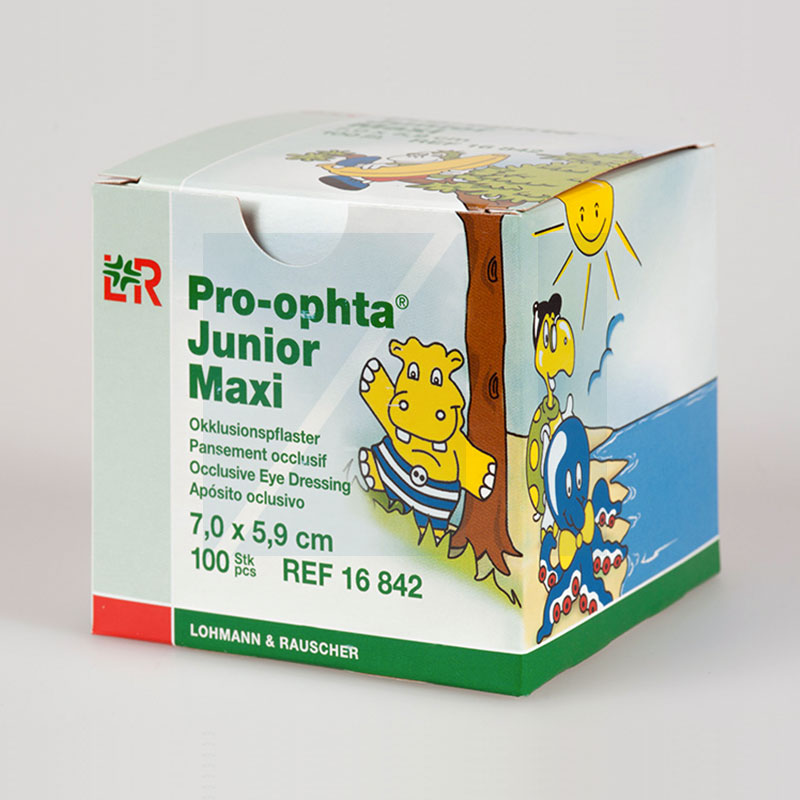 Окклюзионная гипоалергенная повязка для глаз Pro-ophta® Junior Maxi/ Про-офта Джуниор Макси компании Lohmann & Rauscher (L&R)/ Ломанн и Рауше 7,0х5,9 см предназначена для безопасной и надежной фиксации глазных повязок у детей, обеспечивая комфорт и защиту в послеоперационный период или при лечении офтальмологических заболеваний.