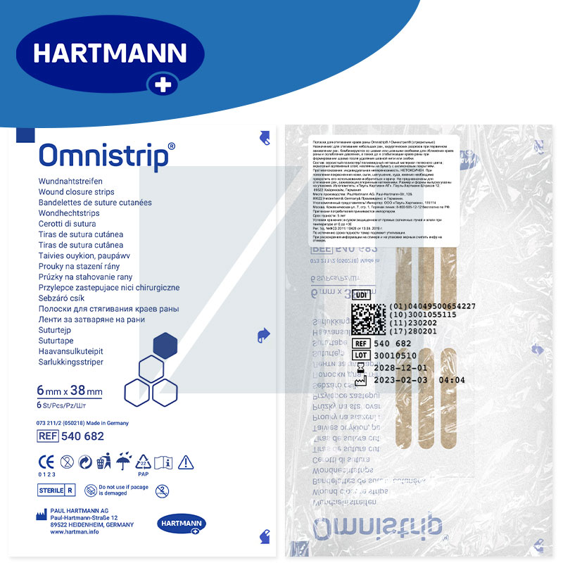 Омнистрип (Omnistrip) компании Hartmann/ Хартманн — пластырные полоски 6 мм х 38 мм на операционные швы для сведения (стягивания) краев раны, закрытия небольших ран и хирургических разрезов, а также стабилизации свежих послеоперационных рубцов.